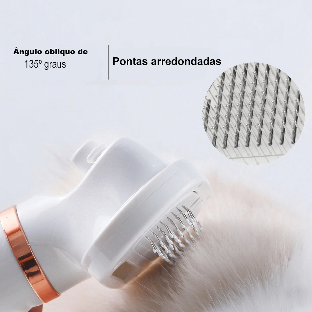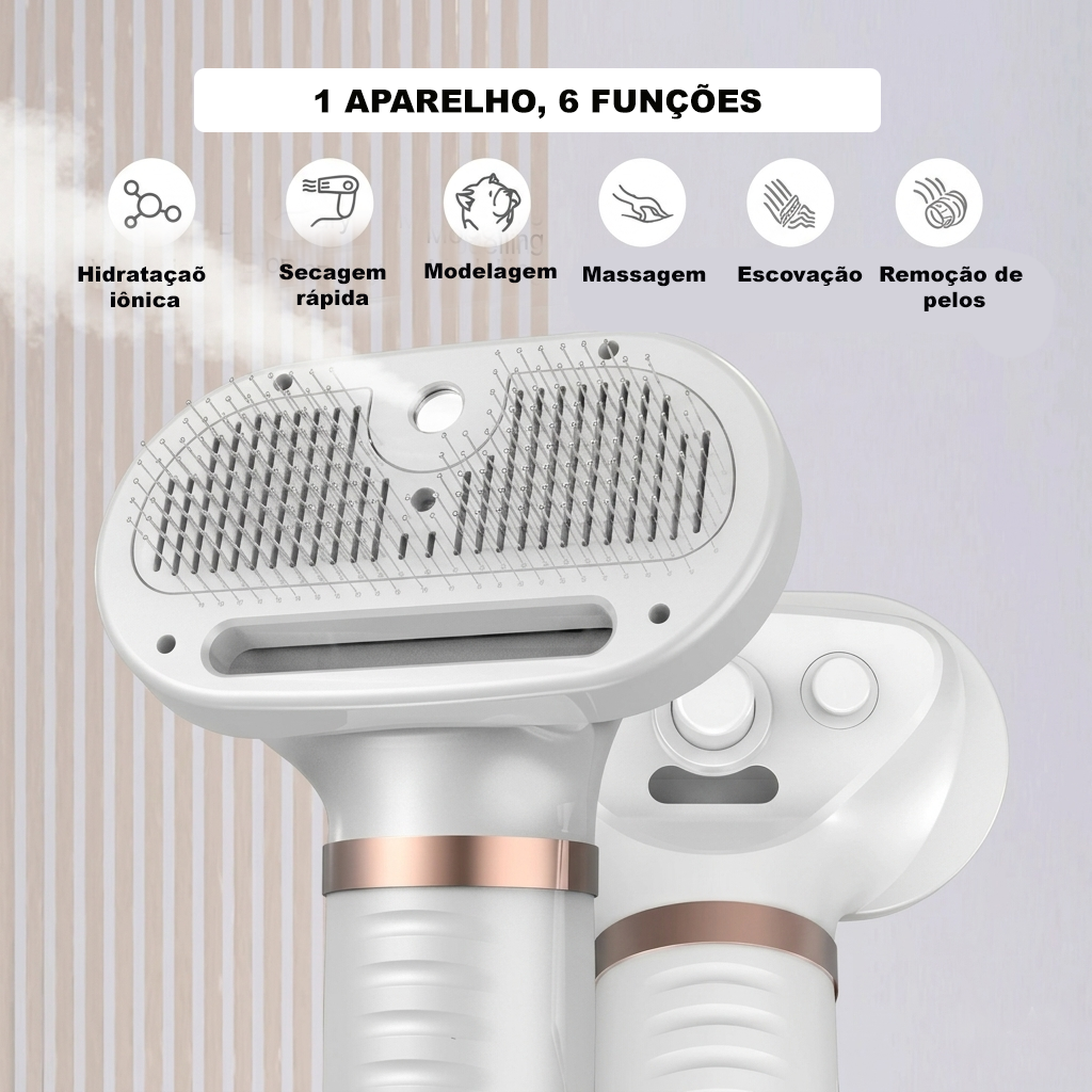 Com um design inteligente e multifuncional, esse aparelho combina secagem + escovação + remoção de pelos em um só movimento, tornando o cuidado com seu pet muito mais rápido, prático e confortável.